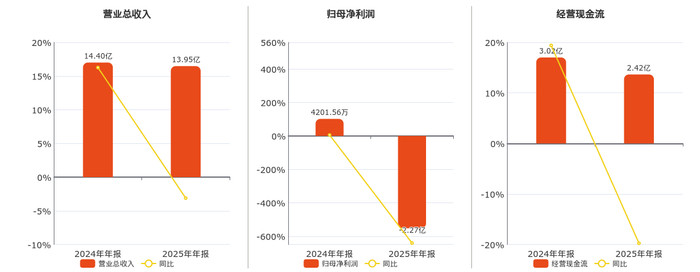 公司营业总收入为13.95亿元,较去年同报告期营业总收入减少4477.90万元,同比较去年同期下降3.11%。归母净利润为-2.27亿元,在已披露的同业公司中排名第24,较去年同报告期归母净利润减少2.69亿元,同比较去年同期下降641.14%。经营活动现金净流入为2.42亿元,较去年同报告期经营活动现金净流入减少5955.54万元,同比较去年同期下降19.74%。